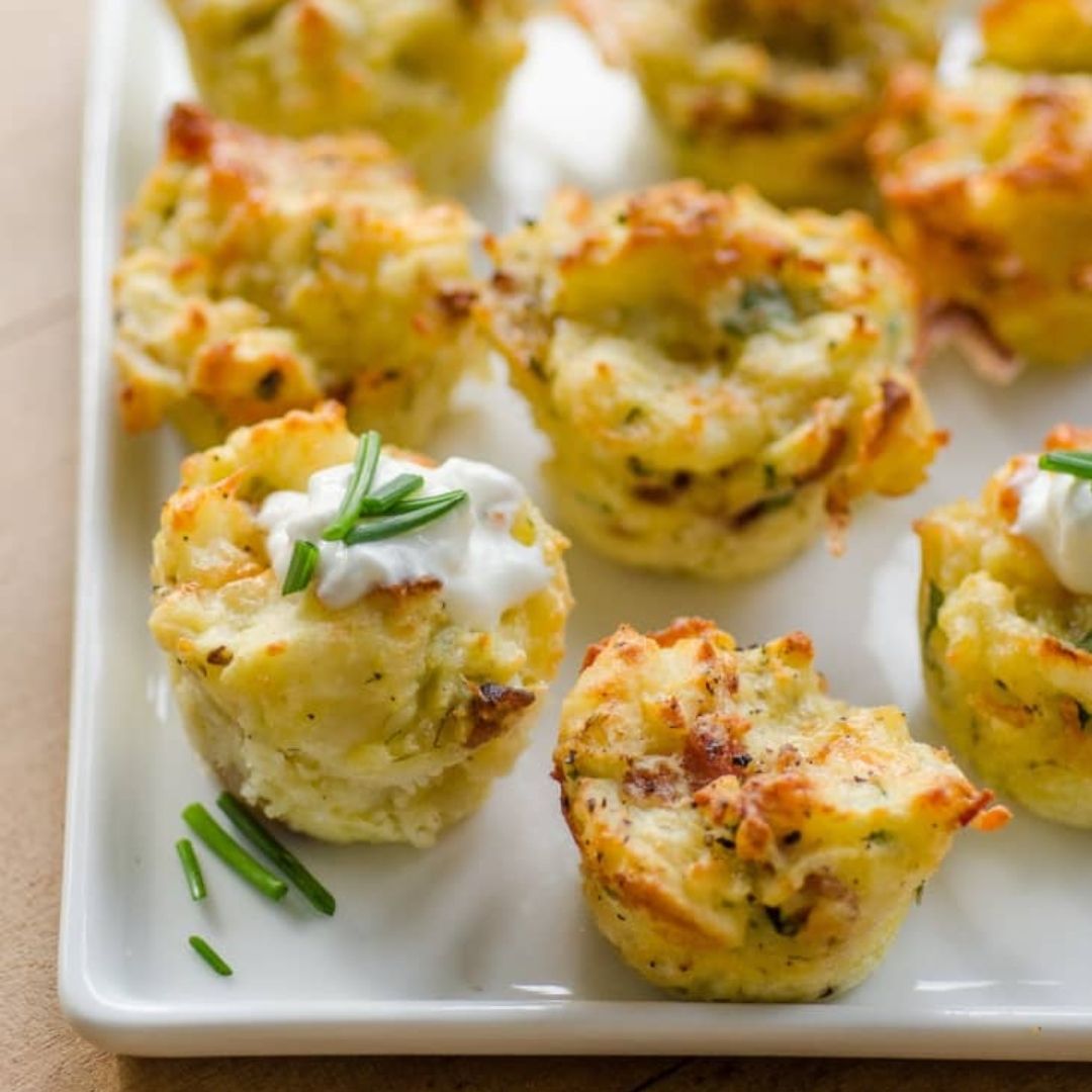 Bake until the potato cups are set, browned on top, and heated through, about 20 minutes. Let cool for about 5 minutes in the pan, then use a spoon or knife to gently release them from the pan. Serve immediately with dollops of sour cream, if desired.