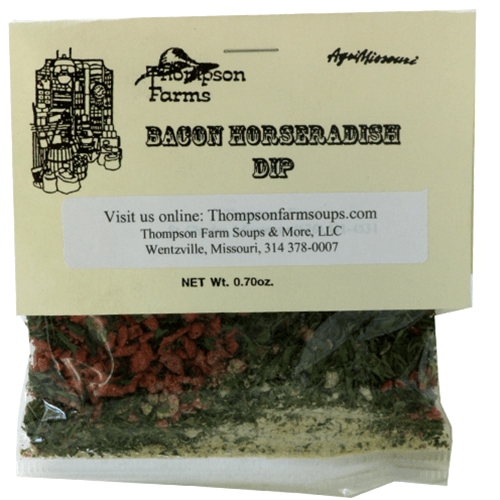 Thompson's Bacon Horseradish Dip is a savory and warm dip. This dip is best served with chips or fresh veggies. Just mix with one cup of mayo and one cup of sour cream. Non-Dairy versions of mayo and sour cream also work! This dip makes about two cups.