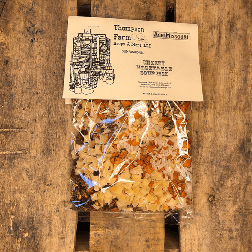 From the hometown favorite, Thompson Farms. Just add a few ingredients to Cheesy Vegetable Soup Mix, and you've got a large, hearty pot of soup. Cheesy Vegetable Soup Mix can be made on the stovetop or in a slow cooker.